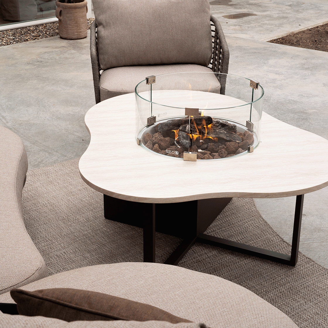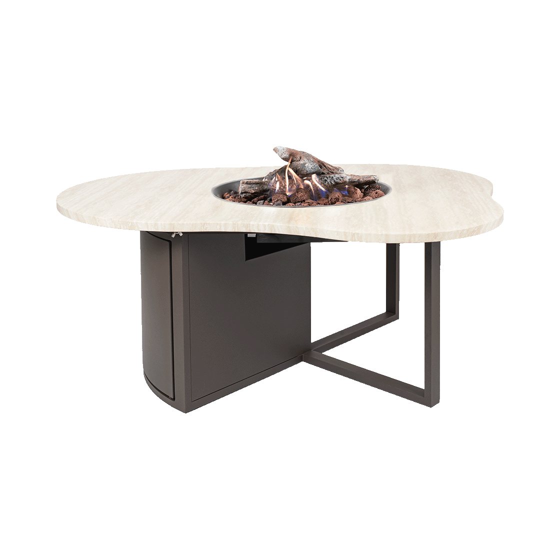 Der Cosiloft Novi in Espressobraun/Steinoptik ist ein eleganter Gas-Feuertisch mit einer einzigartigen, organisch geformten Tischplatte in luxuriöser Marmoroptik. Dieser Designer-Außenkamin verfügt über einen runden Einbrenner, der für gemütliche Wärme und ein schönes Flammenmuster sorgt.