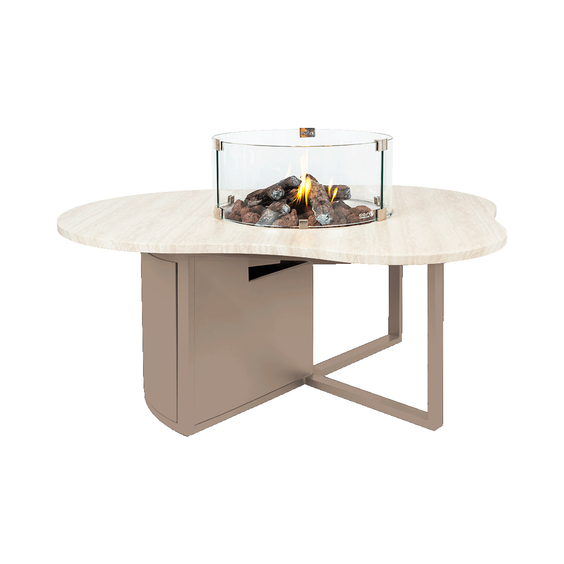 Der Cosiloft Novi in Sandbeige/Steinoptik ist ein eleganter Gas-Feuertisch mit einer einzigartigen, organisch geformten Tischplatte in luxuriöser Marmoroptik. Dieser Designer-Außenkamin verfügt über einen runden Einbrenner, der für gemütliche Wärme und ein schönes Flammenmuster sorgt.