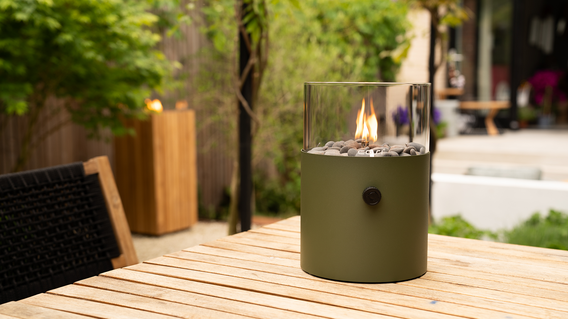 Die Cosiscoop XL Gaslaterne Moosgrün ist der große Bruder der Cosiscoop Original. Dieses moderne Tischmodell ist der ideale Stimmungsmacher für den Garten und das Haus. Versammeln Sie Freunde und Familie und genießen Sie Abende voller Atmosphäre, Wärme und Gemütlichkeit.