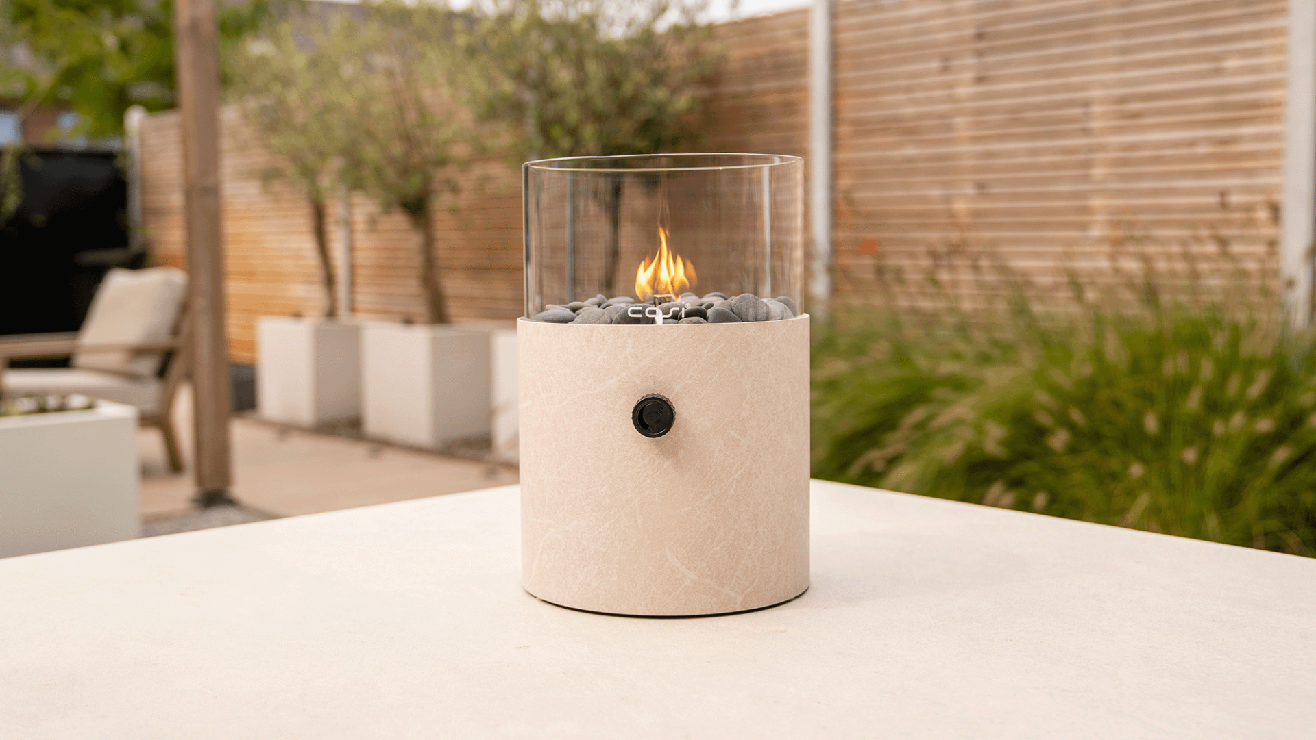 Turn the bottom ring, including the gas cartridge, in the Cosiscoop. Turn until you cannot go further and hear a click. Ensure that the Cosiscoop is upright on a stable, non-flammable surface. Does the Cosiscoop come with glass and/or pebbles? Then place it on top of the Cosiscoop. The pebbles should not cover the burner.
