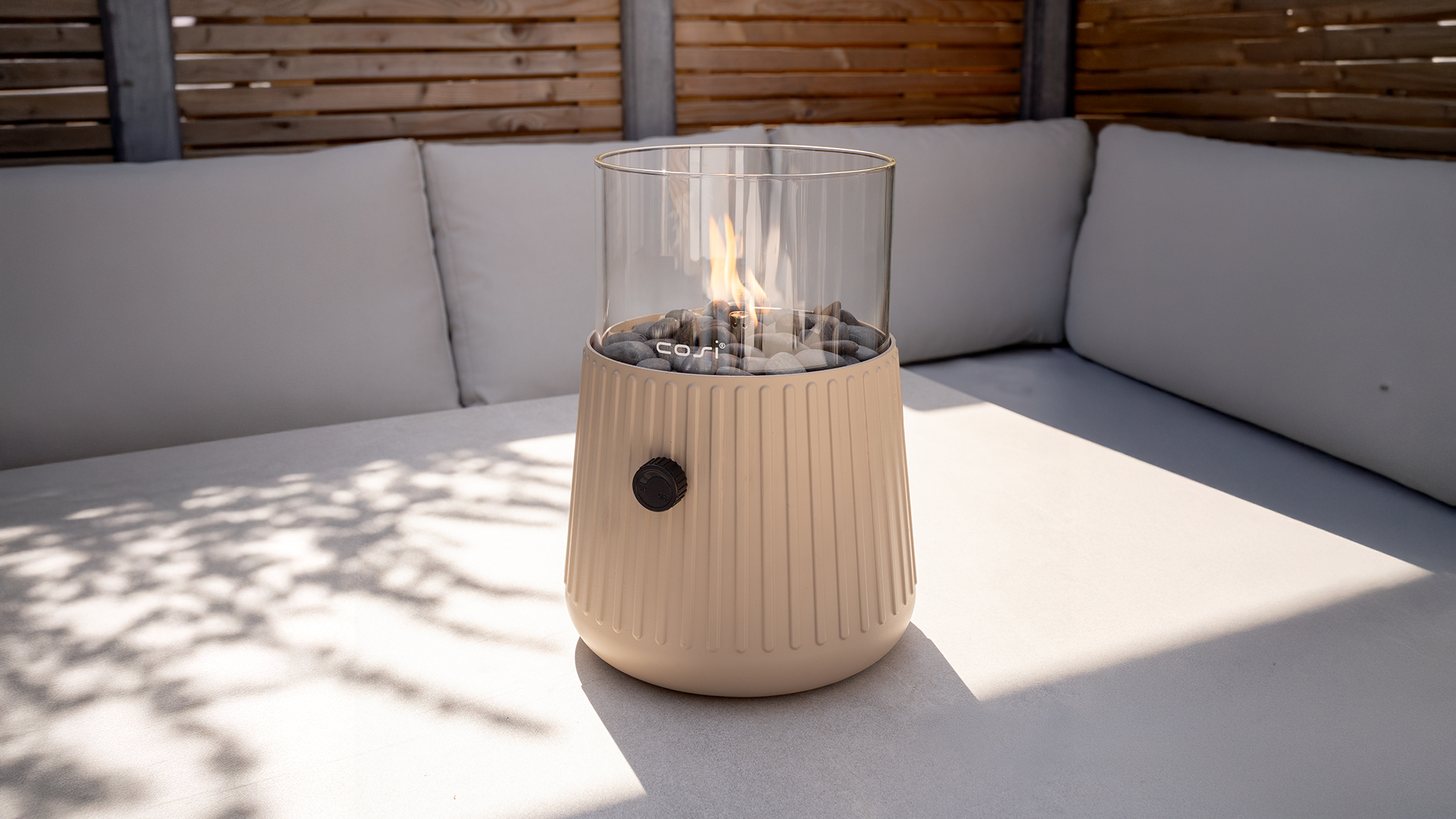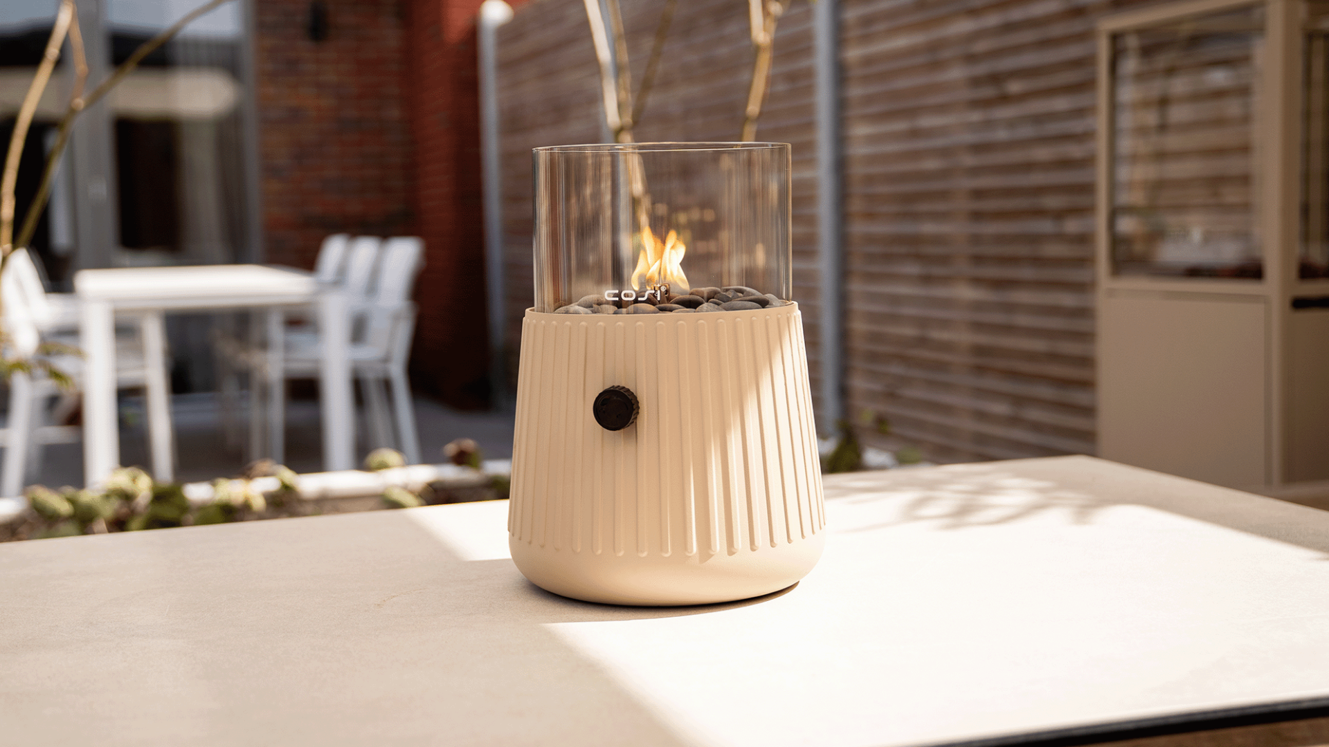 Maak kennis met onze Cosiscoop Bowie sandy beige, een gloednieuwe gaslantaarn in een zandkleurige beige tint. De geribbelde behuizing en afgeronde body geven de lantaarn een speelse en moderne uitstraling. Verzamel vrienden en familie en geniet avondenlang van sfeer, warmte en gezelligheid.