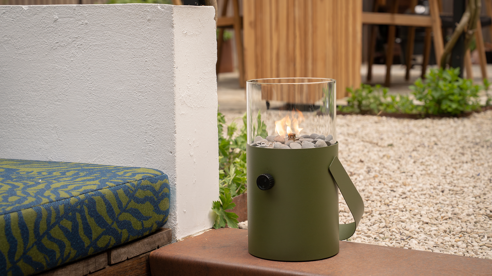 De Cosiscoop Original gaslantaarn moss green is een unieke sfeermaker voor in de tuin en in huis. Dit moderne tafelmodel zet je dankzij de handige draaghendel overal neer. Verzamel vrienden en familie en geniet avondenlang van sfeer, warmte en gezelligheid.